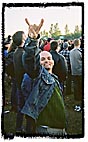 Mariko, Quayley, Graham, Dan, Robbie and Nigel (back to camera) settle down for an evening's lager-drinking | Mariko gets into the heavy metal atmosphere nice and early. She didn't stop | ||||||||||||||||||||||||