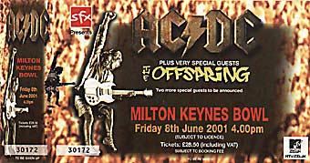 I wasn't even going to go to this, but had such a good time at the Ozzfest a couple of weeks earlier, that I just couldn't resist the chance of another day getting pissed in the sun and listening to heavy metal. Having queued for what seemed like forever on the M1 to reach the car park, we got fleeced £7 for the priviledge of parking in a field, but at least it was only two minutes from the entrance. We got in just after Megadeth started their aimles thrashing. Funny, really - a decade ago and they'd have been headlining. How the mighty are fallen... Queens of the Stone Age riffed like crazy for nearly an hour. Top band. Offspring's dull comedy punk meant plenty of time to sling lager down our necks before AC/DC came on. I'd been to see them at Wembley the previous December and not really got it. I don't think I'd had enough lager that night, as they were awesome at Milton Keynes - overcoming the awful sound system by simply playing very, very loudly. Good things about AC/DC 2001 Best bands of AC/DC 2001 |
