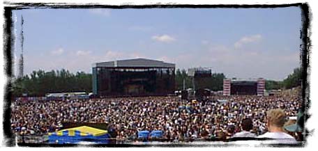 An early start meant catching the coach from Peterborough at 7am. Sadly, despite arriving at the Milton Keynes Bowl at 9am, and getting into the arena at 10, some crap licensing law meant the bars didn't open until noon. Thank goodness Wigg and I had come prepared with cans of lager, though we'd consumed half the supply on the coach down. Once the bars were open, we were horrified to discover that they were only selling Budweiser and Strongbow. A little ingenuity led to the creation of snakebites, which we happily quaffed all day, getting through a nice, round dozen pints.