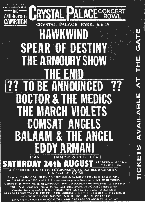 The main reason for going to this - good cause aside - was to see Dr and the Medics, Spear of Destiny and the March Violets on the same bill for a bargain £2.50. Crystal Palace Concert Bowl is an odd venue - the stage is on the far side of a small lake, which separates the performers from the crowd. At least the bowl-shaped arena gives everyone a good view. And it allows the more enthusiastic members of the crowd to cool down by jumping into the lake... there are plenty of takers, despite the signs warning of all sorts of nasty bugs lurking in the water. An pleasant surprise is the appearance of the Comsat Angels - rare live performers at the best of times. Sadly, this isn't the best of times for them. A bit past their peak, they're a disappointment. Things liven up nicely with some typical Medics lunacy - this is almost a year before their underground credibility all but vanishes with "Spirit in the Sky." Spear of Destiny are, as ever, a triumph, but Hawkwind provide the biggest surprise of the day when they're joined on stage by none other than Lemmy. And legendary topless dance Stacia, too. Downloads |